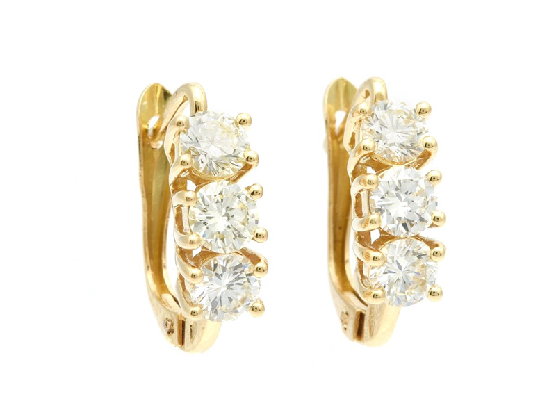 ÖRHÄNGEN, 18K guld, 6 briljantslipade diamanter ca 1,34 ctv, ca TCa-Ca/VS-SI, höjd 15 mm, vikt 3,4 g, stift, en diamant med nagg på kuletten.