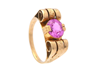 RING, 14K guld, syntetisk rosa safir, stl 16,25 mm, vikt 3,9 g, safiren har slitna fasettkanter samt skadad kulett.