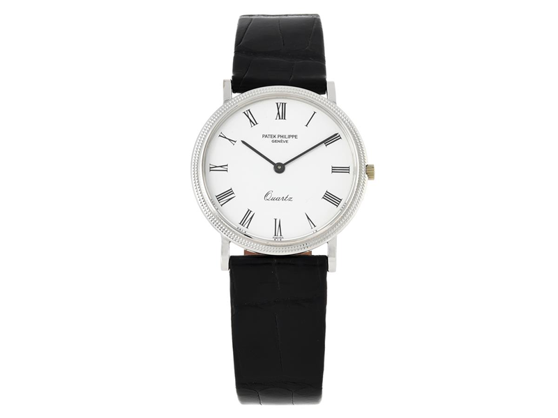 PATEK PHILIPPE, Genève, Calatrava, s.k. "Spider Dial", Cal E 27, Serie nr. 1502947, Ref nr. 3744, Boett nr. 2784918, herrur, 33 mm, 18K guld, quartz, safirglas, skadad urtavla ("Spider Dial"), läderband, originalspänne i 18K vitguld, ca 1990.