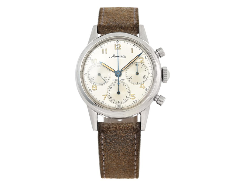 MINERVA, "Incabloc", "Swiss", kronograf, herrur, 36 mm, Cal Valjoux 72, Ref nr. VD 712, Boett nr. 427761, stål, manuell, plexiglas, läderband, ca 1965.