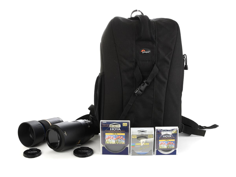 Objektiv Tamron 70-300mm snr: 116186 med motljusskydd, Tamron 90mm Macro snr: 593242 med motljusskydd, Linsfilter 3st Hoya varav 2st 55mm 1st 67mm i fodral, Kameraväska Lowepro