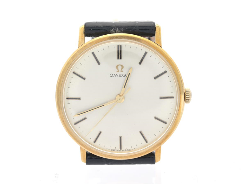 Armbandsur Omega 18K 31,3g, manuell, repigt plastglas, 32mm, graverad boett, slitet svart läderband