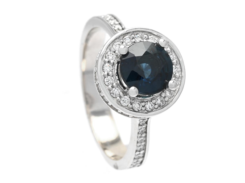 RING, 18K vitguld, rund fasettslipad safir ca 1,34 ct, briljantslipade diamanter ca 0,48 ctv, ca W-TCr/VS-SI, storlek 17 mm, vikt 4,5 g.