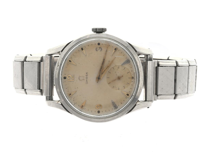 Omega armbandsur liten sekundvisare, manuell, stål, Ø35mm, repigt plastglas, flexiarmband, 50-tal, personligt graverad baksida