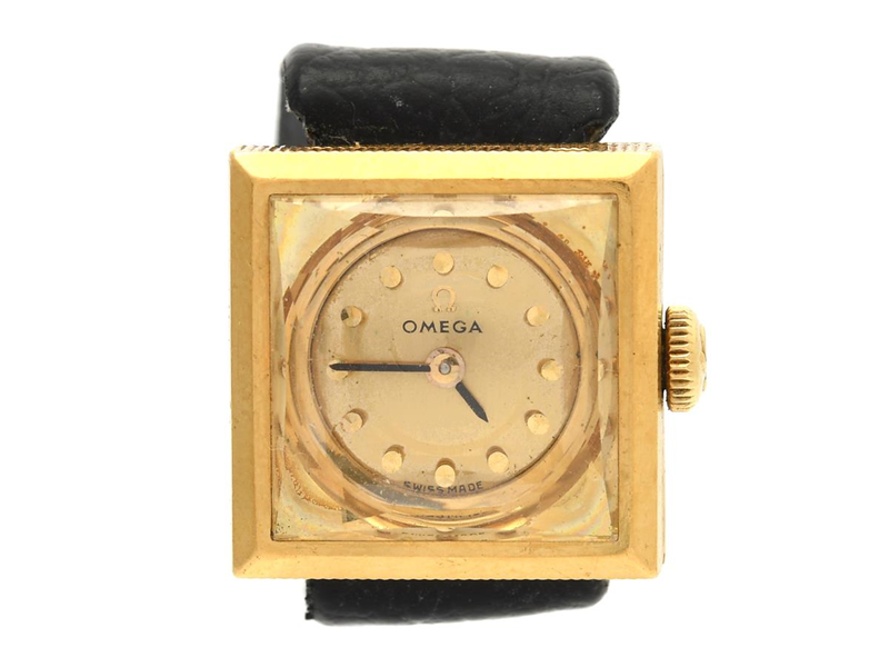 OMEGA, damur, 15 x 15 mm, Cal 580, Serie nr. 19847513, Ref nr. OT 10535, Boett nr. 10535 62, 18K guld, manuell, safirglas, skadad urtavla, integrerat läderband, ca 1962.