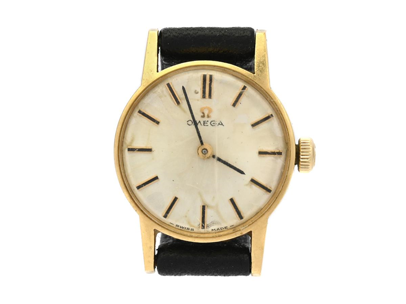 OMEGA, damur, 19 mm, Cal 620, Serie nr. 22416612, Ref nr. BA 511.002, Boett nr. 511.002, 18K guld, manuell, plexiglas (skadat), skadad urtavla, läderband, ca 1965.