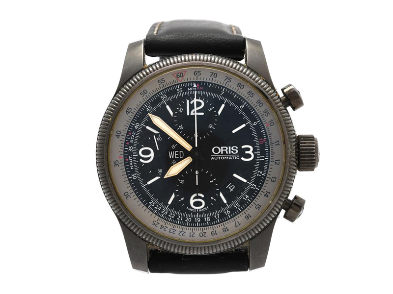ORIS, Big Crown, X1 Calculator, Cal 674 (ETA 7750), Serie nr. 3104511, Ref nr. 01 675 7648 4264-07 5 23 77, Boett nr. 7648 42, kronograf, herrur, 46 mm, stål/svart PVD, automatisk, safirglas, dag, datum, glasbaksida, läderband (se fördjupad info), originalspänne, tillverkad 2011, cert, augusti 2018, box (skadad), ytterkartong.