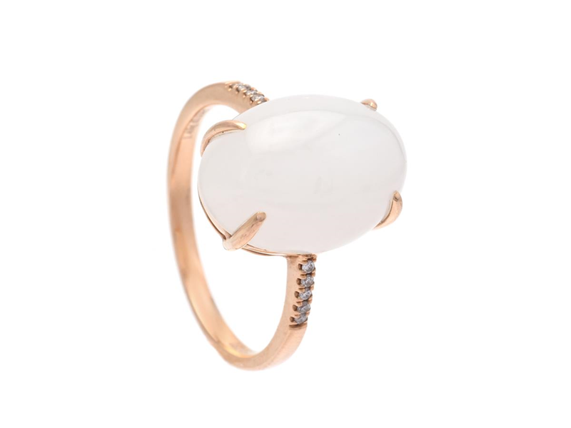 RING, 18K roséguld, cabochonslipad vit bowenit, 10 briljantslipade diamanter 0,034 ctv enligt gravyr, stl 17,25 mm, vikt 3,4 g.