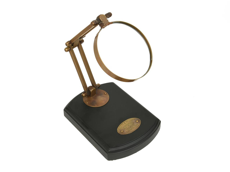 FÖRSTORINGSGLAS, stativ i trä och mässing, prydnadsföremål, diameter 10 cm, längd 18 cm, höjd 36 cm.