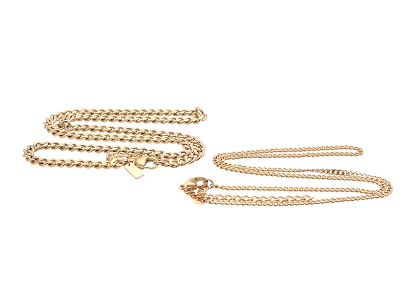 2 KEDJOR, guldpläterat stål, smalare pansarlänk 53-59 cm, bredare pansarlänk 53-58 cm, vikt 32,0 g.