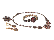 SMYCKESET, 4 delar, granatgarnityr, gulmetall, collier ca 40 cm, brosch ca 3,5 cm, armband ca 18 cm, örhängen med skruvmekanism ca 3,5 cm, några granater saknas, några svaga länkar.