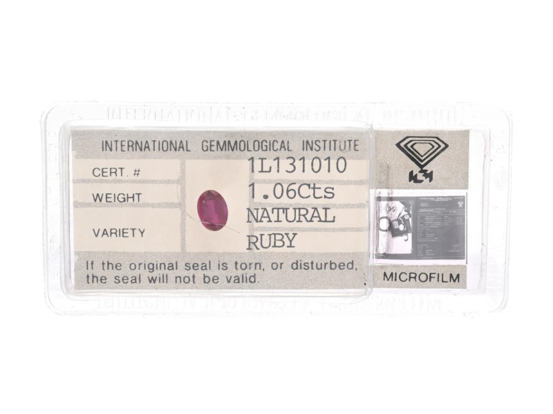 RUBIN, ovalslipad 1,06 ct, IGI certifikat 1L131010, förseglingen är bruten då plasten har spruckit.