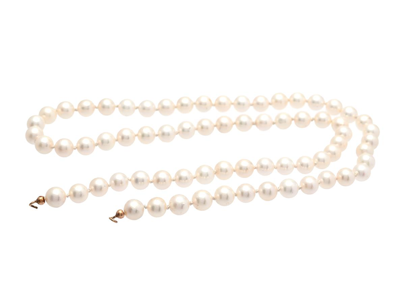PÄRLRAD, odlade pärlor, ca 6,5 - 6,75 mm, dobbar i 18K guld, ej lås, längd 53 cm.