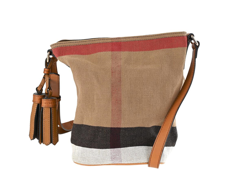 VÄSKA, BURBERRY, Ashby Bucket Bag, brunt tyg, röd, vit, brunt läder, guldfärgade beslag, 16x24x15 cm, inner pochette, 15x13 cm.