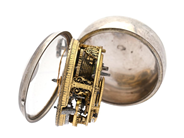 DEBEAUFRE, London, fickur, 49 mm, silver, spindelgång, nyckeldragare, urtavla i silver (champlevé), bucklor, ytterboett (skadad), 57 mm, tillverkad i repousseteknik, ca 1730.
