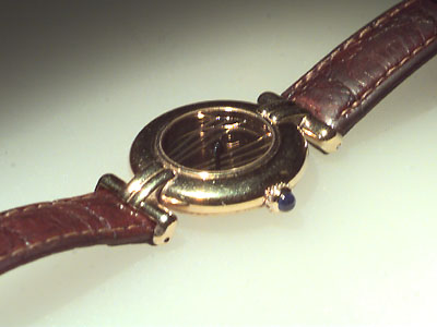 CARTIER, Rivoli, damur, quartz, förgyllt silver, läderband.
