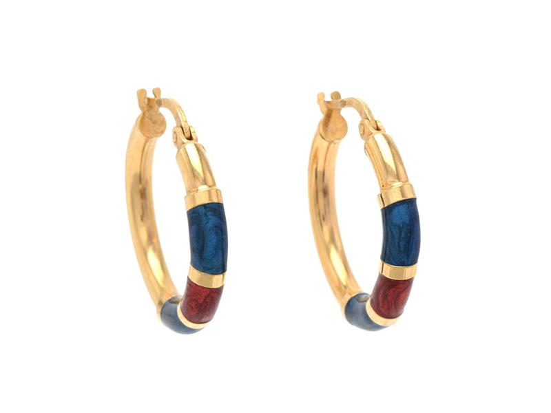 ÖRRINGAR, 14K guld, blå och röd emalj, diameter 22 mm, stift, vikt 3,2 g.