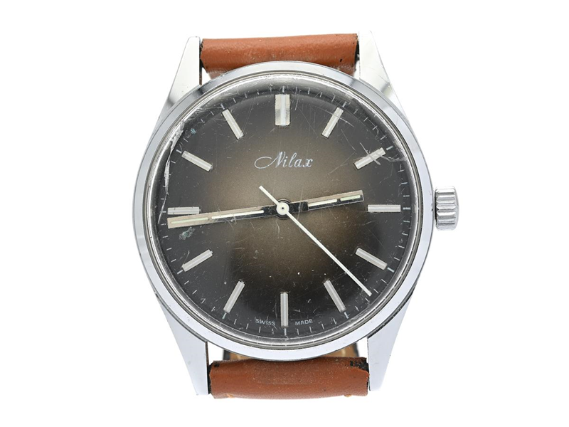 NILAX, herrur, 34 mm, Boett nr. 11 213, vitmetall, manuell, plexiglas (skadat), skadad urtavla, läderband, ca 1970.