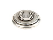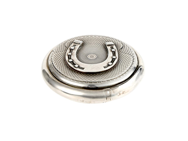 SNUSDOSA, silver, rund med hästsko, kontrollmästare Ivan Vonifatiyevich Yevstigneyev, S:t Petersburg 1870, diameter 55 mm, vikt 59,5 g, monogram, trasig.