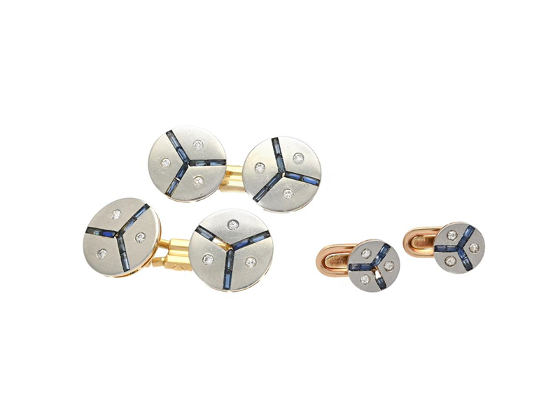 MANSCHETTKNAPPAR SAMT SKJORTKNAPPAR, 14K / 18K guld / platina, safir, 18 briljant- eller åttkantslipade diamanter ca 0,30 ctv, total vikt 16,5 g, 2 stenar saknas.