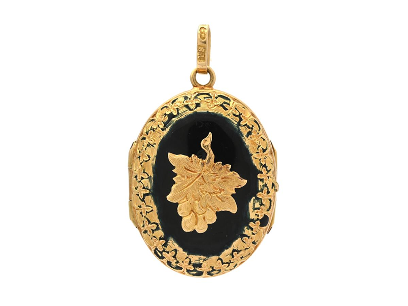 MEDALJONG, 18K guld, svart emalj, F Severin, 1872, vikt 16,0 g, emaljskador.