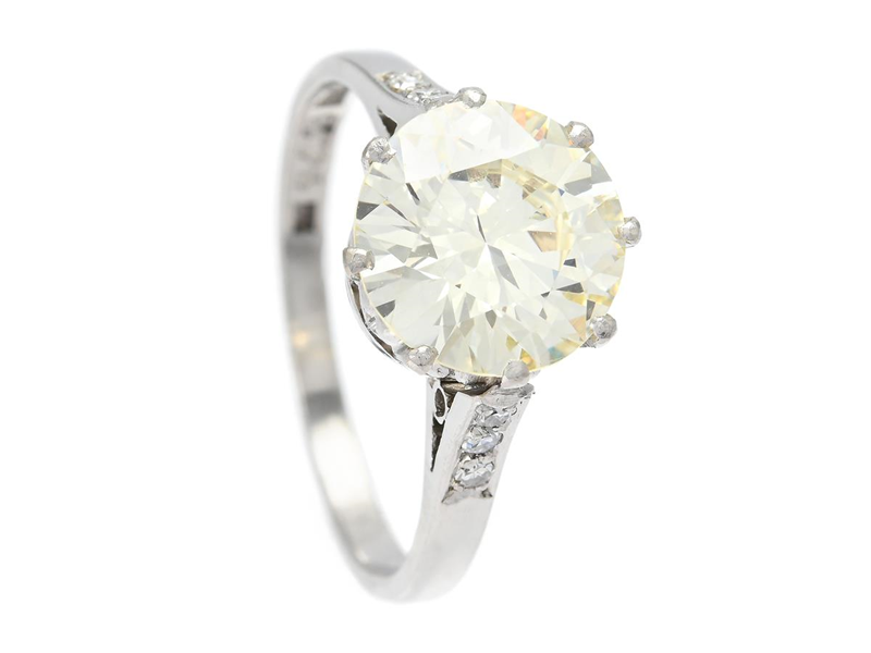 RING, platina, briljantslipad diamant ca 2,34 ct, ca Ca(M)/VS1, åttkantslipade diamanter ca 0,06 ctv, Erik Thomassons Guld & Juvelfirma, Stockholm 1951, stl 16,75+ mm, vikt 4,1 g, mittstenen har liten kulettfasett, polerlinjer på fasetter, extra fasetter och litet nagg vid rondisten.