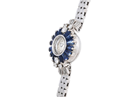OMEGA, damur, 18 mm, Cal 440, Serie nr. 14949080, Boett nr. 11379941, 18K vitguld, manuell, safirglas (skadat), krans med safirer (14 st. trapetslipade) samt briljanter/diamanter på boetten (12 st. ca TW/VS, ca 0,70 ctv), defekt (servicebehov), integrerad länk i 18K vitguld (ej original), längd 160 mm, totalvikt 29,8 gram, ca 1955.