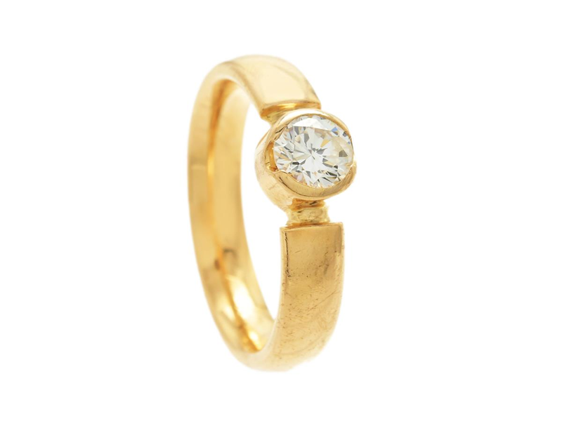 ENSTENSRING, 18K guld, briljantslipad diamant 0,43 ct enligt gravyr, ca W/P, storlek 16 mm, vikt 5,6 g, diamanten har inneslutning som når ytan invid rondist, gravyr "med kärlek".