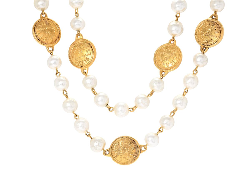 COLLIER, CHANEL, Vintage, vita imitationspärlor, guldfärgade motiv, längd 82 cm, vikt 112 g, ask.