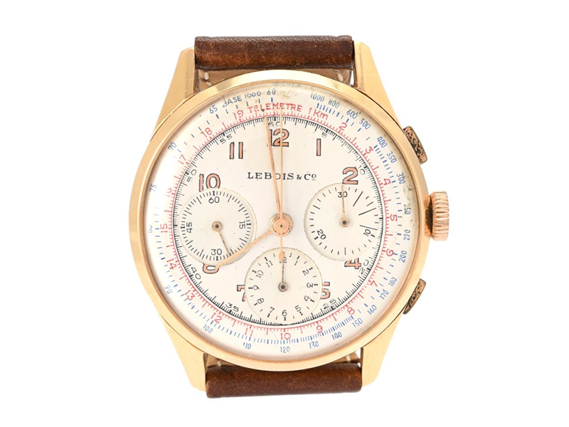 LEBOIS & Co, "Telemetre", kronograf, Cal Valjoux 72 (AOC), Boett nr. 901 28 180, herrur, 37,5 mm, 18K guld, manuell, plexiglas, skadad urtavla, bucklor bakboett, läderband, ca 1955.