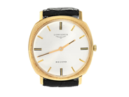 LONGINES, Record, Cal Record 666, Boett nr. 313050, herrur, 31,5 mm, 18K guld, manuell, plexiglas, skadad urtavla, OBS: visare ej centrerade, boett/urverk signerat Record, läderband, ca 1970.