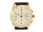 UNIVERSAL, Genève, Uni-Compax, "Gobbi, Milano", Cal 285, Serie nr. 1606563, Boett nr. 12445, kronograf, herrur, 34,5 mm, 18K guld, manuell, plexiglas, skadad urtavla, defekt (går ej, akut servicebehov), läderband, ca 1952.