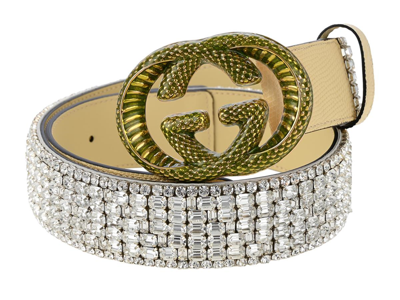 GUCCI, BÄLTE, Memorable buckle, beiget skinn, grönt och guldfärgat spänne GG, vita stenar, stl 75, bredd 4 cm, märkt 710100, tag, dustbag. Excellent Condition.