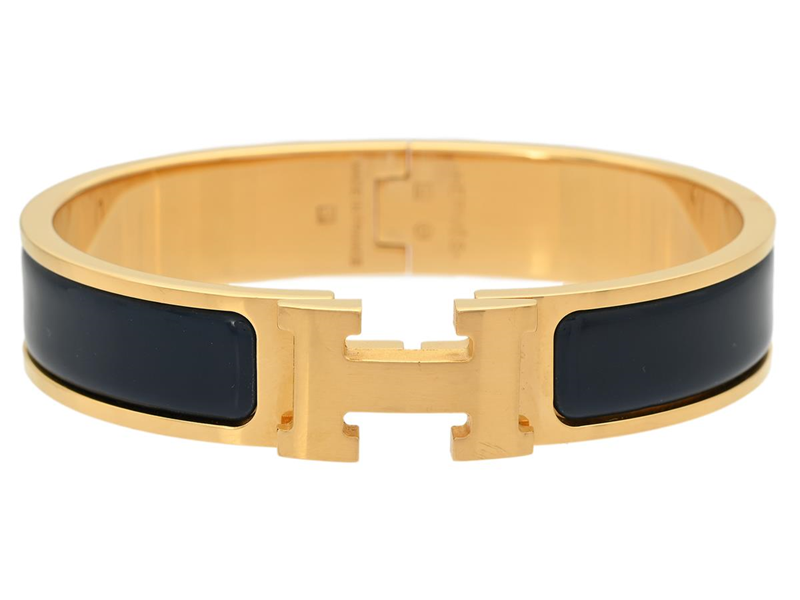 HERMÈS, ARMRING, Clic H Bracelet, marinblå emalj, guldfärgat spänne, diameter 5,5 cm, märkt Q in square, Made in France, smyckespåse, originalask. Very Good Condition.