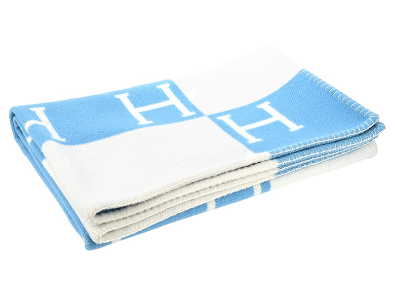 HERMÈS, PLÄD, Avalon baby blanket, 90% merinoull, 10% cashmere, ca 97x136 cm, blå, vit, kvitto från 2021, originalkartong. Good Condition.
