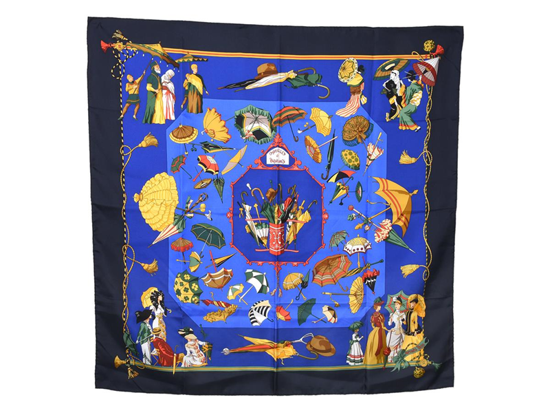 HERMÈS, SCARF, Ombrelles et Parapluies, Hubert de Watrigant, 100% siden, 90x90 cm, blå, guld, röd, care booklet. Very Good Condition.