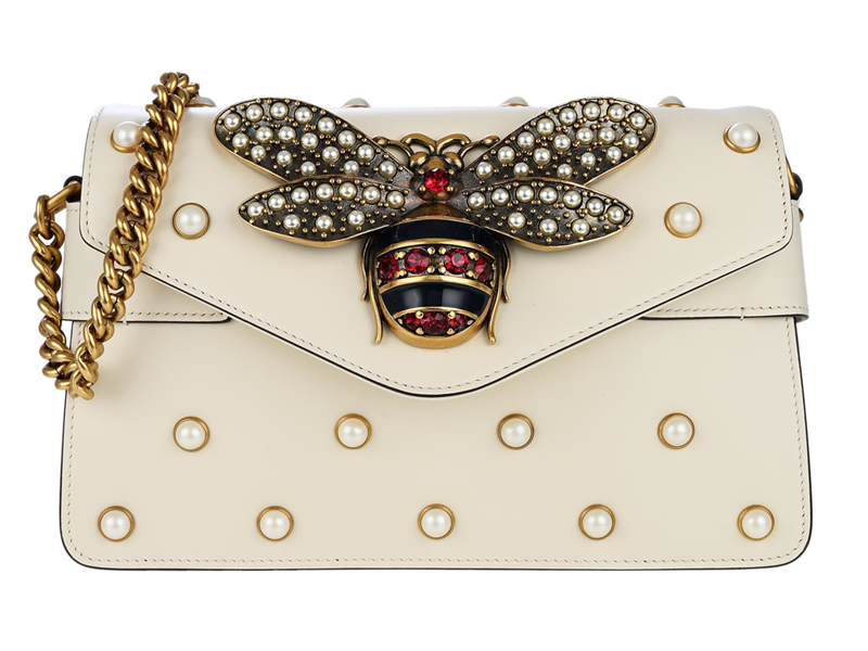 GUCCI, VÄSKA, Mini Leather Queen Margaret Broadway Satchel, vitt skinn, vita, röda stenar, guldfärgade beslag, 25x16x4 cm, blå, röd, vit canvas avtagbart axelband, dustbag. Excellent Condition.