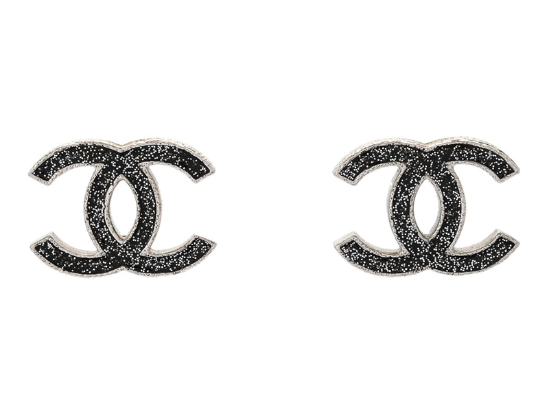 CHANEL, ÖRHÄNGEN, Logo CC, svart, silver glitter, silverfärgad metall, stift, 1,5x1,5 cm, vikt 2,45 g, märkt B10 A, år 2010, kvitto från 2010, smyckespåse, originalask. Very Good Condition.