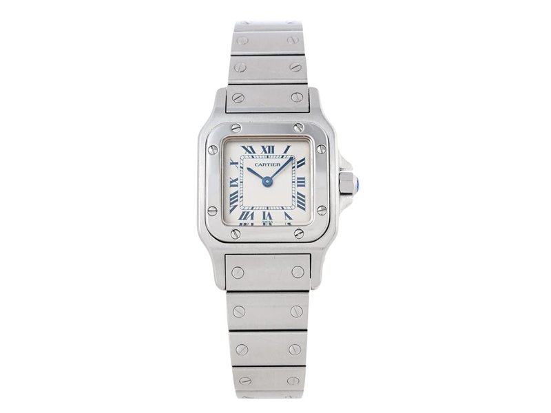 CARTIER, Santos Galbée, Cal 157, Boett nr. 1565/CC856303, damur, 24 x 24 (35) mm, stål, quartz, safirglas (repor), integrerad originallänk, viklås, ca 1998, box.