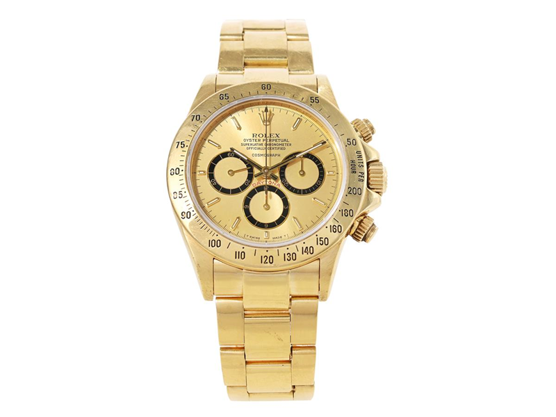 ROLEX, Oyster Perpetual, Cosmograph, Daytona (T Swiss Made T), Chronometer, s.k. "Floating Dial", "Mark 1 Bezel", Ref nr. 16528, Serie nr. R985263, Cal 4030, Verk nr. 16417, Boett nr. 16500, kronograf, herrur, 40 mm, 18K guld, automatisk, safirglas (nagg/repor), utbytta visare (Luminova), Oysterlocklänk (First Generation), viklås, Ref nr. 78668-M12/103, totalvikt 167,8 gram, cert, augusti 1989.