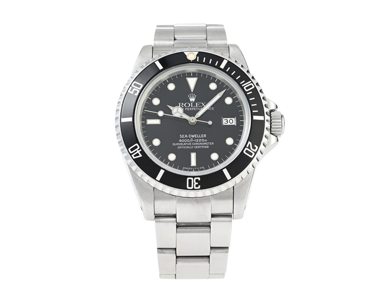 ROLEX, Oyster Perpetual Date, Sea-Dweller (4000 ft=1220 m, Swiss-T<25), Chronometer, Ref nr. 16660, Serie nr. 7370846, Cal 3035, Verk nr. 1041528, Boett nr. 16660, herrur, 40 mm, stål, automatisk, safirglas (nagg/repor), datum, utbytt urtavla (senare Mark IV/Tritium), heliumventil, Fliplocklänk, viklås, Ref nr. 93160-H/592, längd 180 mm, ca 1982.