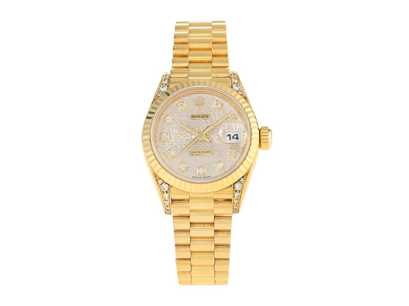 ROLEX, OP, Datejust (Swiss Made), Chronometer, s.k. "Jubilee Diamond Dial", Ref nr. 69238, Serie nr. W033057, Cal 2135, Verk nr. 3474218, Boett nr. 69000A, damur, 26 mm, 18K guld, automatisk, safirglas (nagg), datum, diamanturtavla (10 st. 8/8), briljanter på hornen (24 st. TW/VVS, ca 0,20 ctv), Presidentlänk, viklås, Ref nr. 8570-V12/68 B, längd 165 mm, totalvikt 74,8 gram, cert, september 1998.