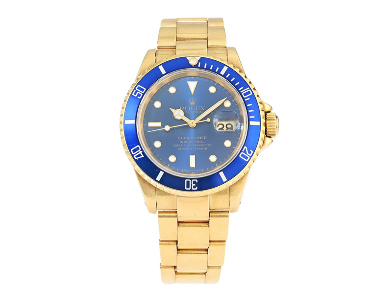 ROLEX, Oyster Perpetual Date, Submariner (1000ft=300m, Swiss-T<25), Chronometer, Ref nr. 16618, Serie nr. X889644, Cal 3135, Verk nr. 6944746, Boett nr. 16610, herrur, 40 mm, 18K guld, automatisk, safirglas (nagg), datum, utbytta visare (Luminova), Fliplocklänk (stift), viklås, Ref nr. 92908-R10/46 B, totalvikt 165,9 gram, ca 1993.