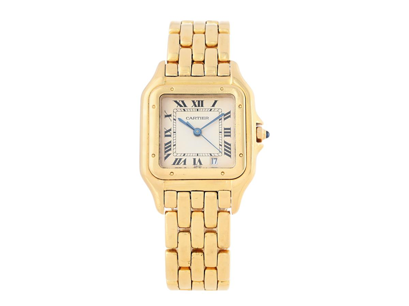 CARTIER, Panthère, Cal 83, Boett nr. 8839540878, unisex, 26,5 x 27 (36) mm, 18K guld, quartz, safirglas (repa), datum, originallänk, viklås, längd 175 mm, totalvikt 101,8 gram, ca 1985.