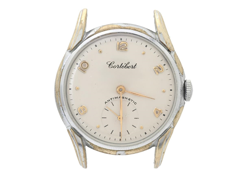 CORTÉBERT, herrur, 33 mm, Cal 677, Boett nr. 2195095, vitmetall, manuell, plexiglas, liten sekundvisare, renoverad urtavla, skadad urtavla, skadad boett, ca 1955.