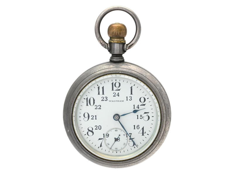 WALTHAM, fickur, 58,5 mm, Cal 818, 15 stenar, 18 size, Serie nr. 15943412, Boett nr. 184552, silver (925), ankargång, motiv (lokomotiv), ca 1907.