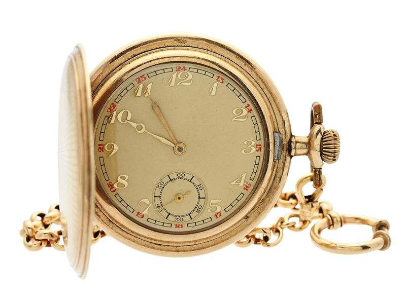 FICKUR, 53 mm, savonett, Boett nr. 5892905, doublé, ankargång, skadad urtavla, bucklor, ca 1920, fickurskedja i gulmetall.