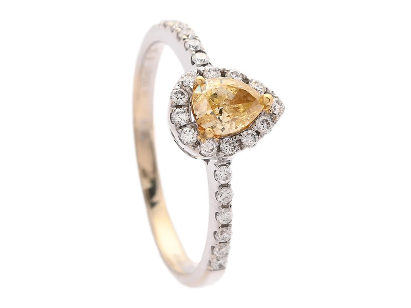 RING, 18K vitguld, droppslipad diamant 0,38 ct, Fancy Intense Yellow/P1, GIA certifikat 16747478, 24 briljantslipade diamanter ca 0,30 ctv, ca TW-W/VS, stl 16,25 mm, vikt 2,2 g,