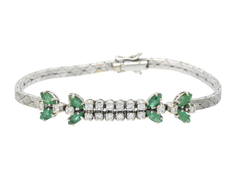 ARMBAND, 18K vitguld, delvis matterad yta, navetteslipade smaragder, 18 briljantslipade diamanter ca 0,72 ctv, ca W/VS, längd 17,5 cm, vikt 17,9 g.