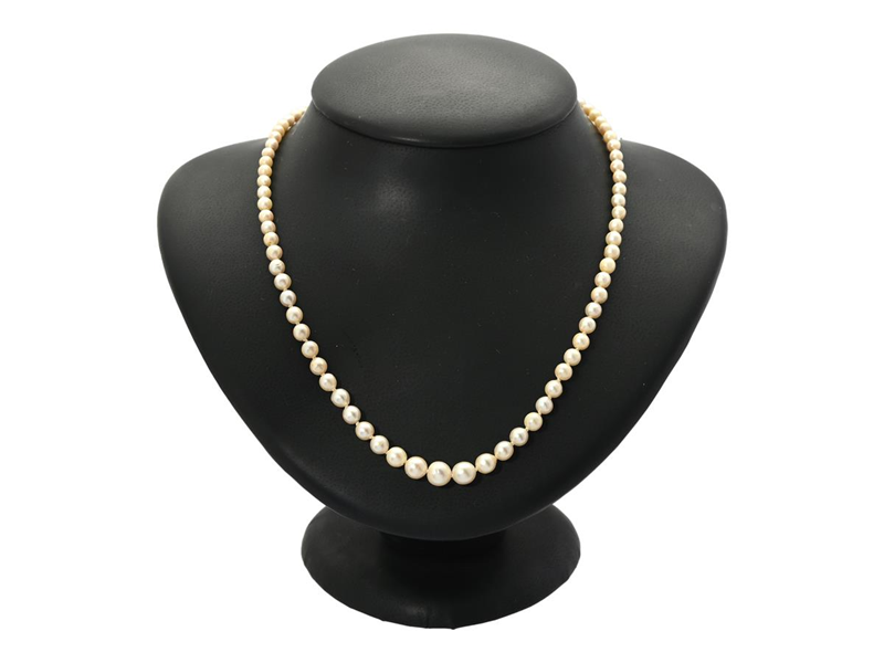 PÄRLCOLLIER, odlade pärlor, ca 3,5 - 6,75 mm, lås i silver med paste, längd 53 cm, vikt 12,9 g.